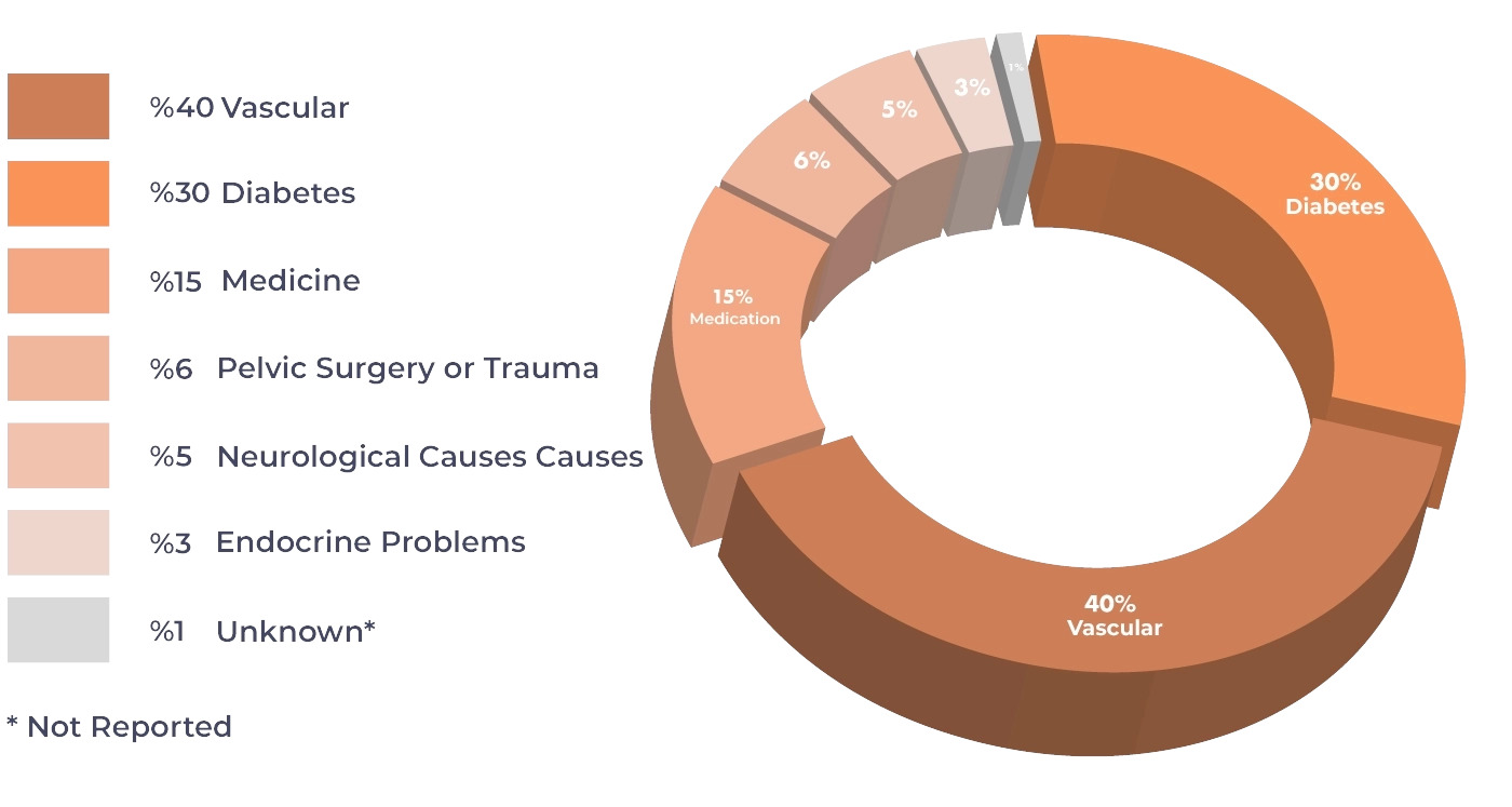 Vascular problems and diabetes account for a large proportion of the physical causes of erectile dysfunction.¹ Pelvic surgery (for example, radical prostatectomy), trauma, neurological disorders, endocrine problems, and certain medications can also contribute to ED.